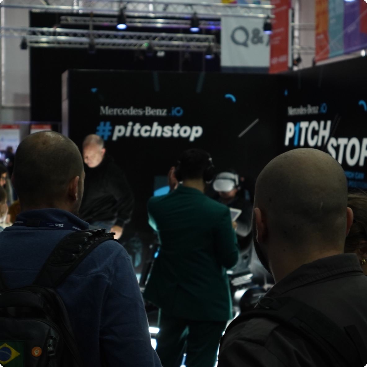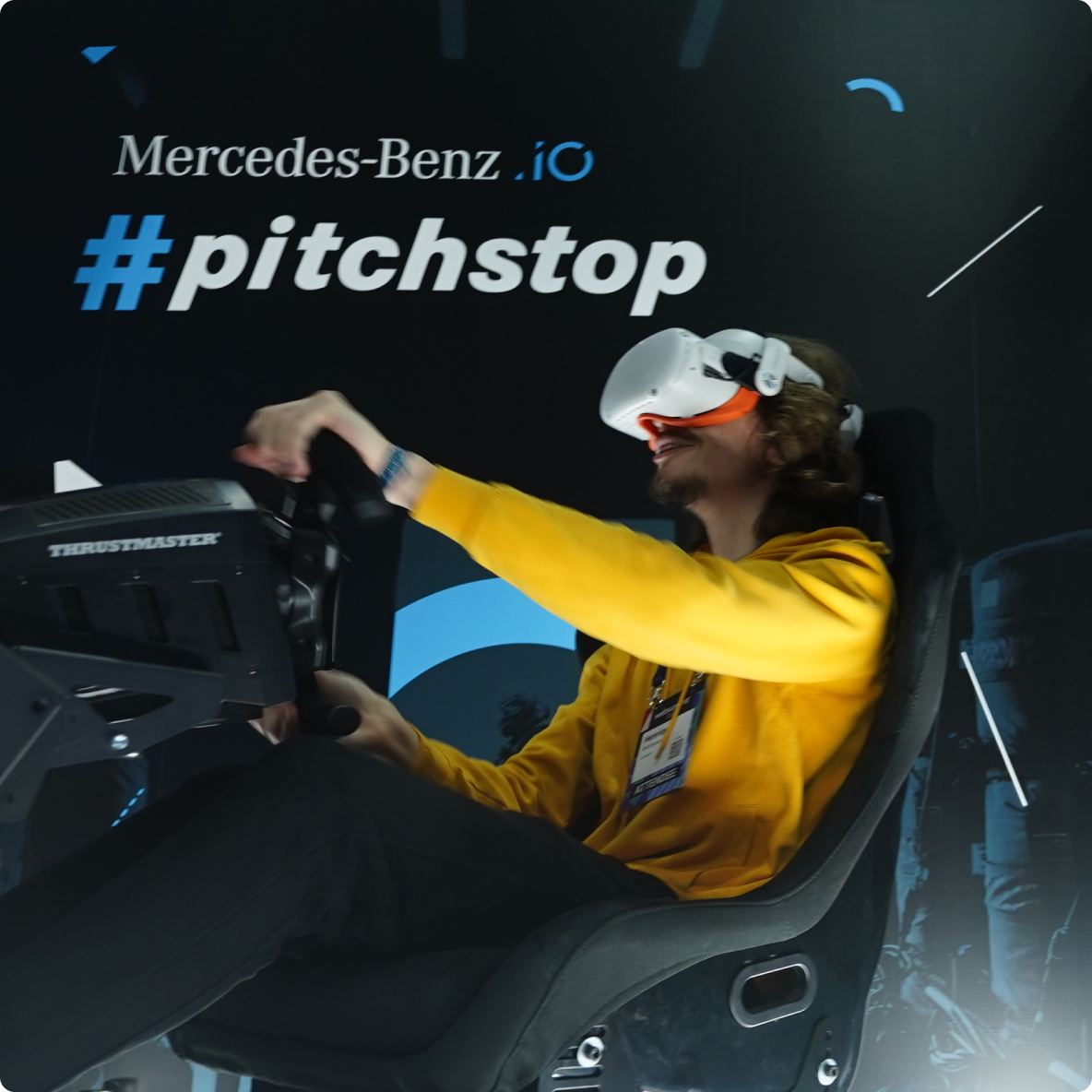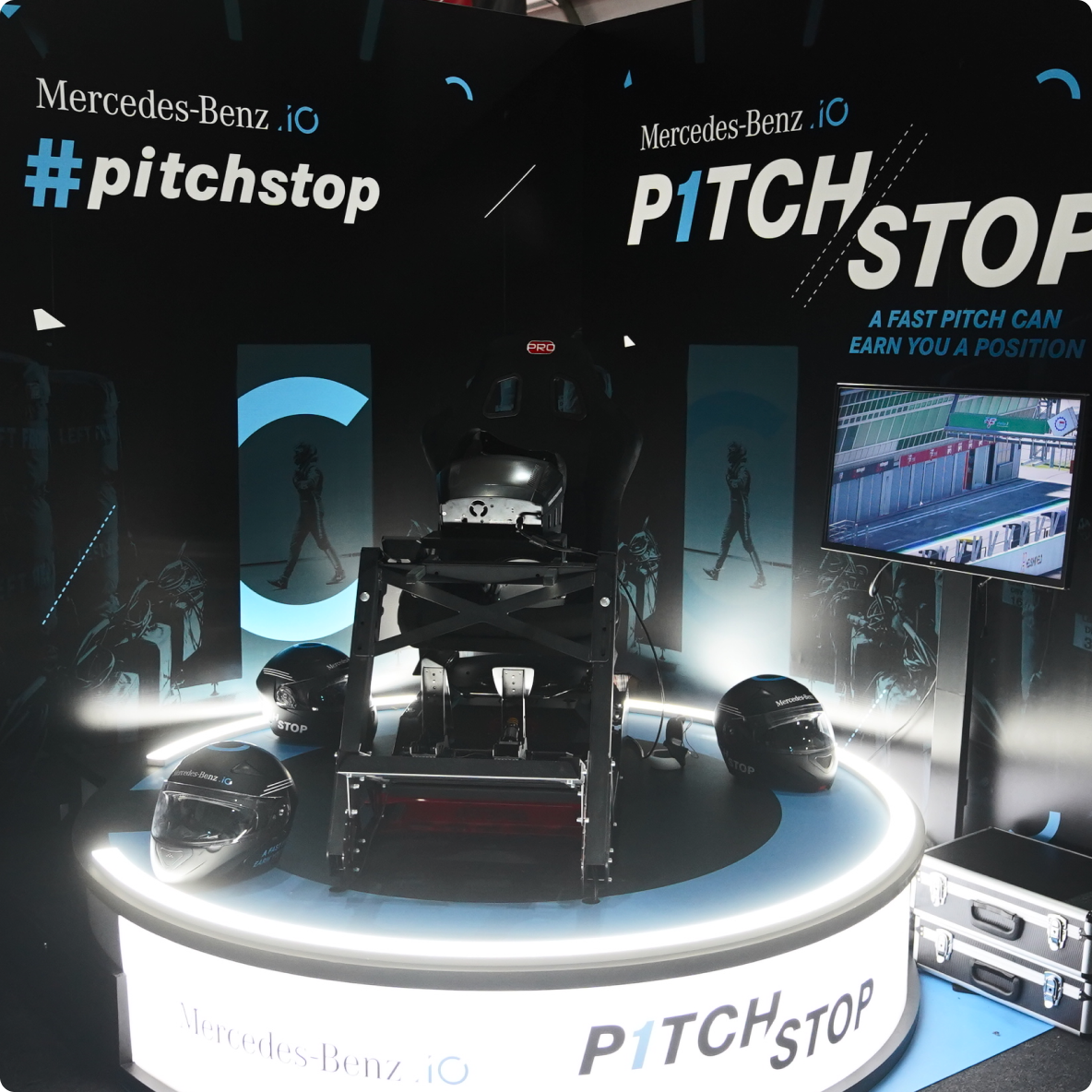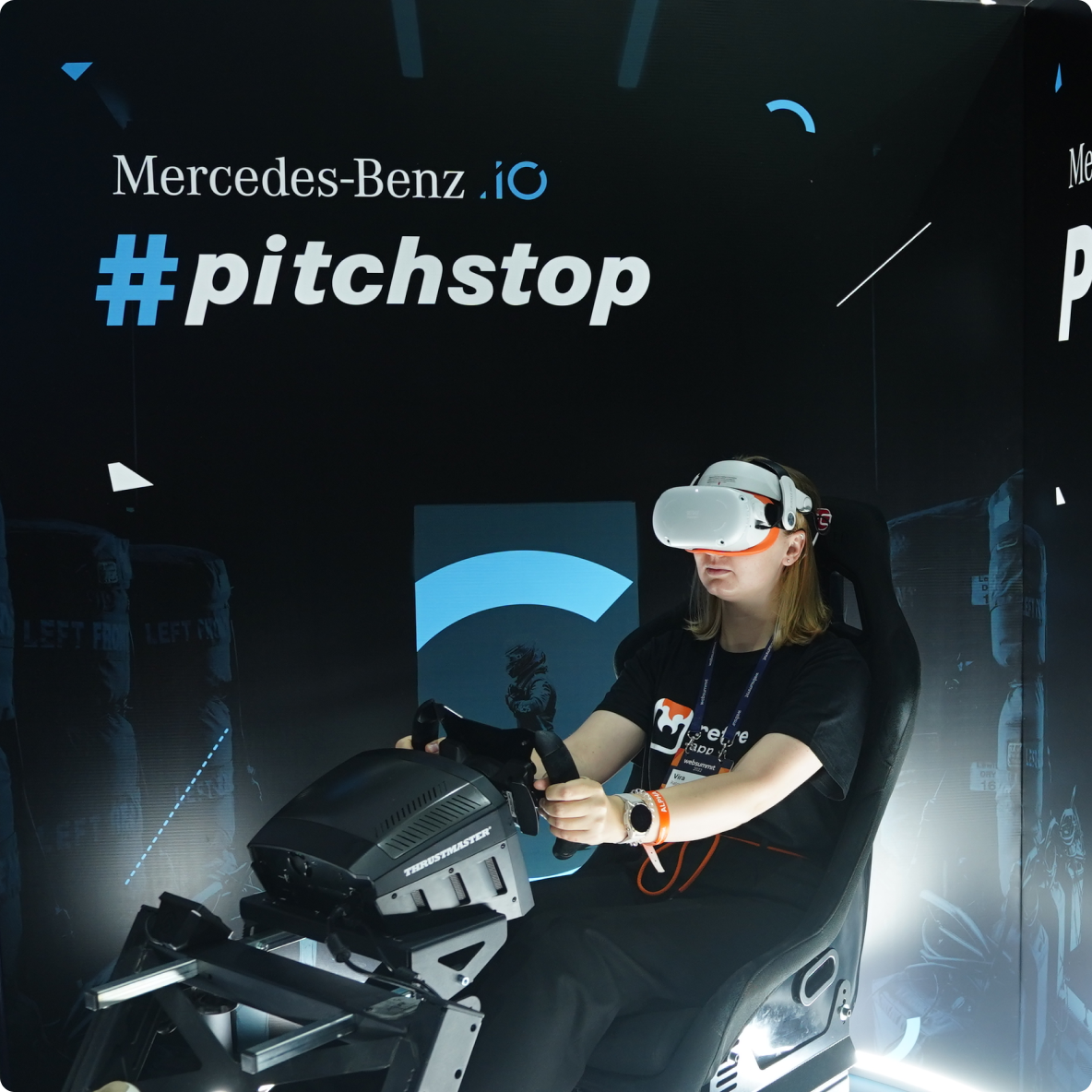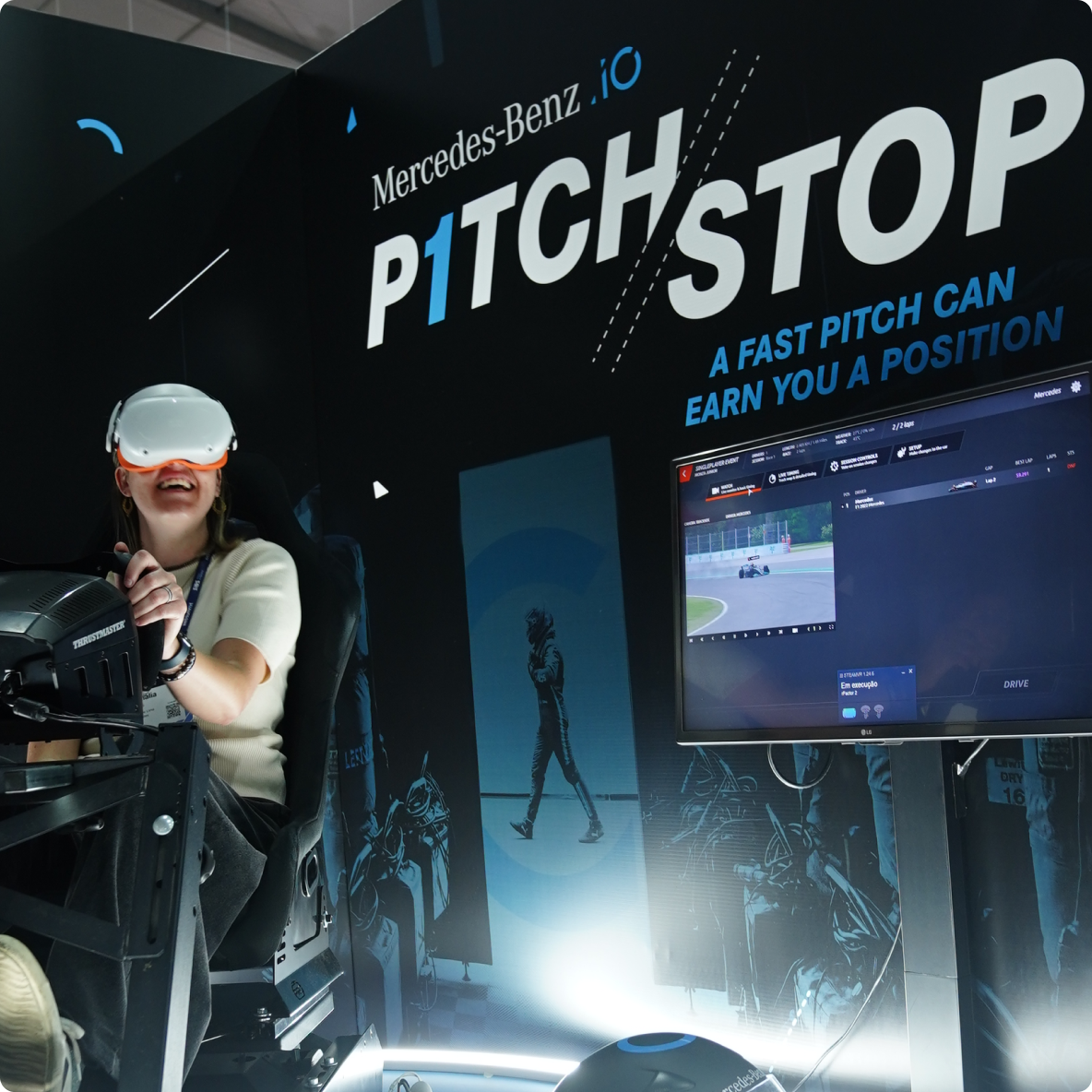 "PitchStop" was born—a high-adrenaline VR experience where participants raced a Mercedes-Benz F1 car while simultaneously answering job interview questions. This gamified approach tested candidates’ ability to think under pressure, mirroring real-world challenges in a fast-paced tech environment. The design of the stand incorporated sleek F1-inspired elements, with bold Mercedes-Benz.io branding ensuring high visibility. The result was an activation that not only engaged attendees but also positioned Mercedes-Benz.io as an innovative employer in the tech industry.